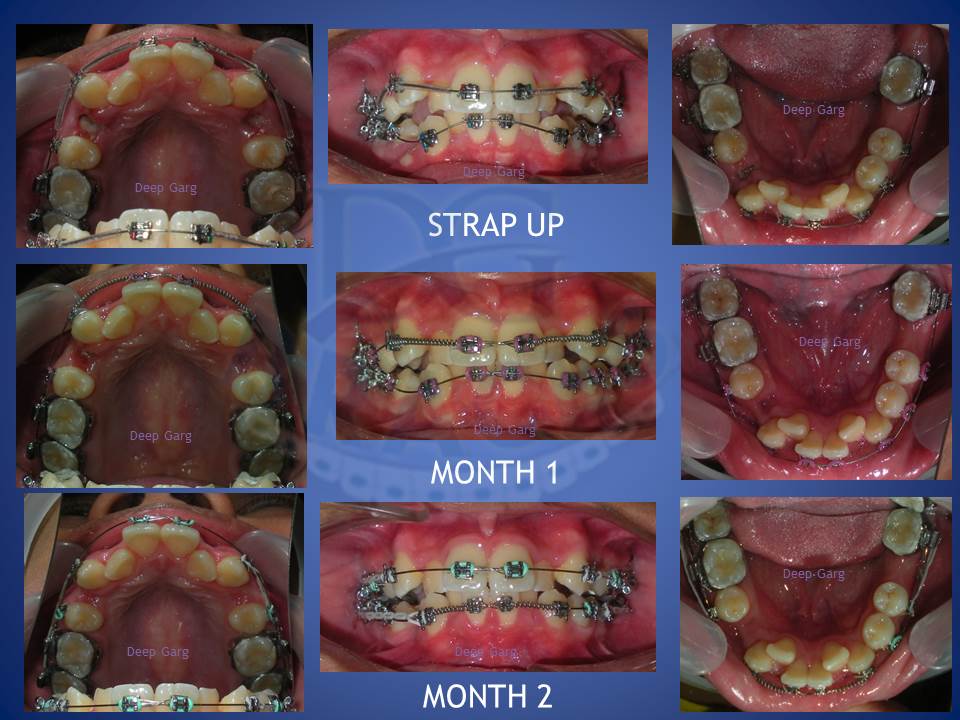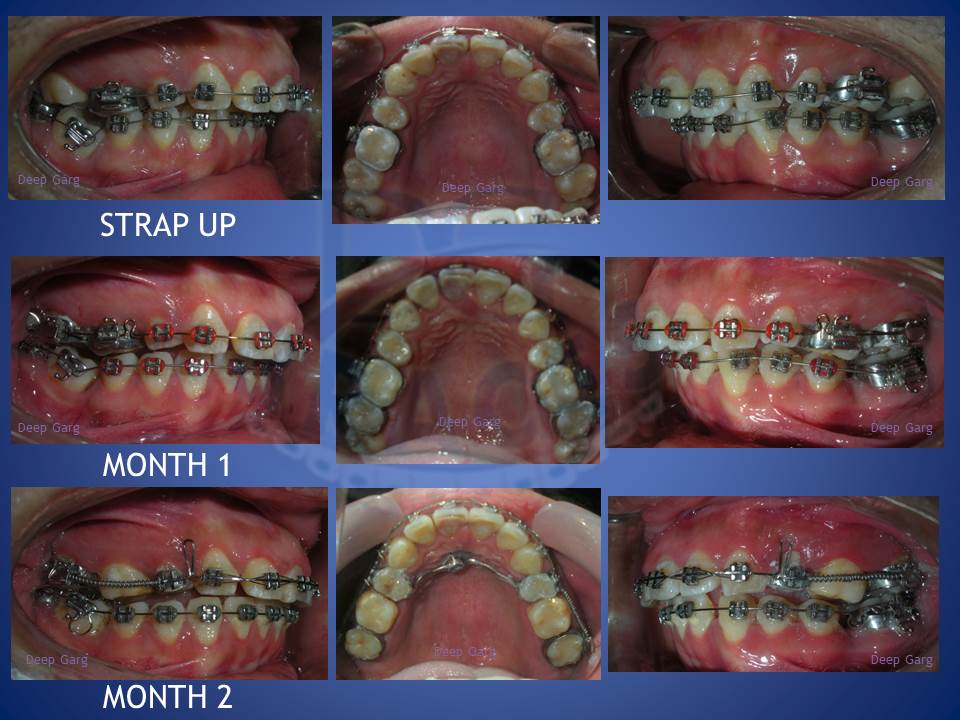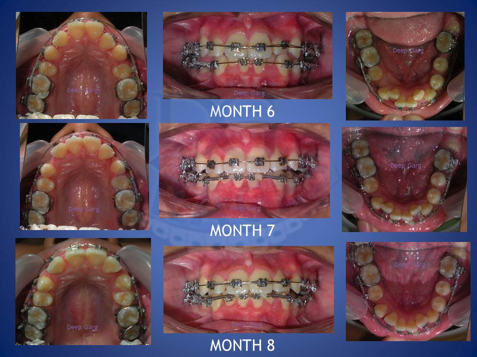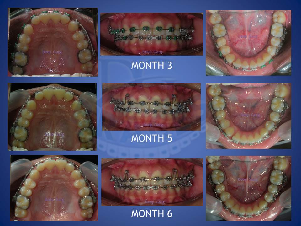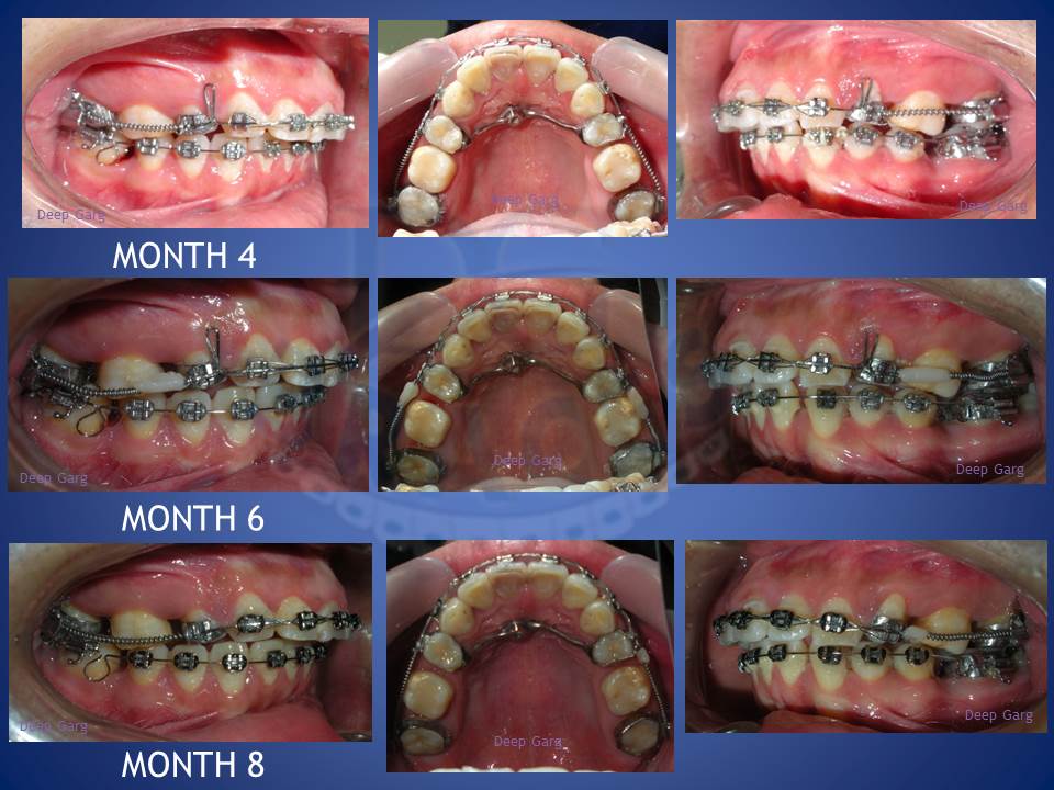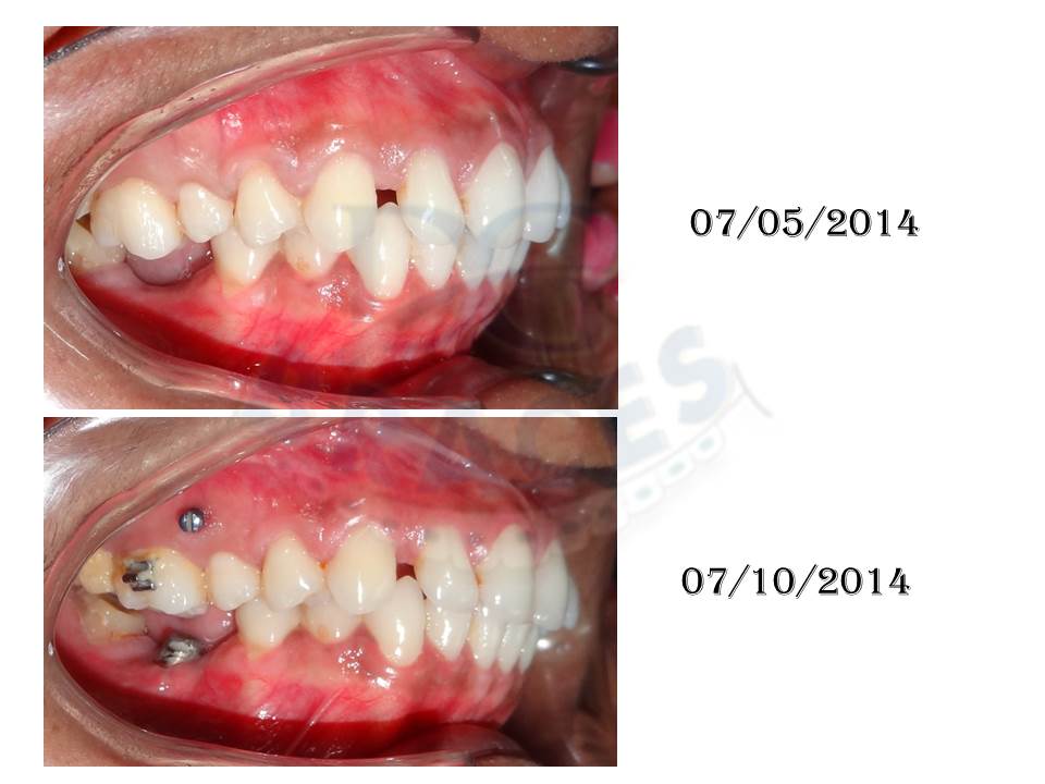 3.Molar distalisation though difficult can be very well done in cases where excessive spaces are required and no extractions can be afforded. Here a palatal Miniscrews was used and distalisation was done with coil springs.